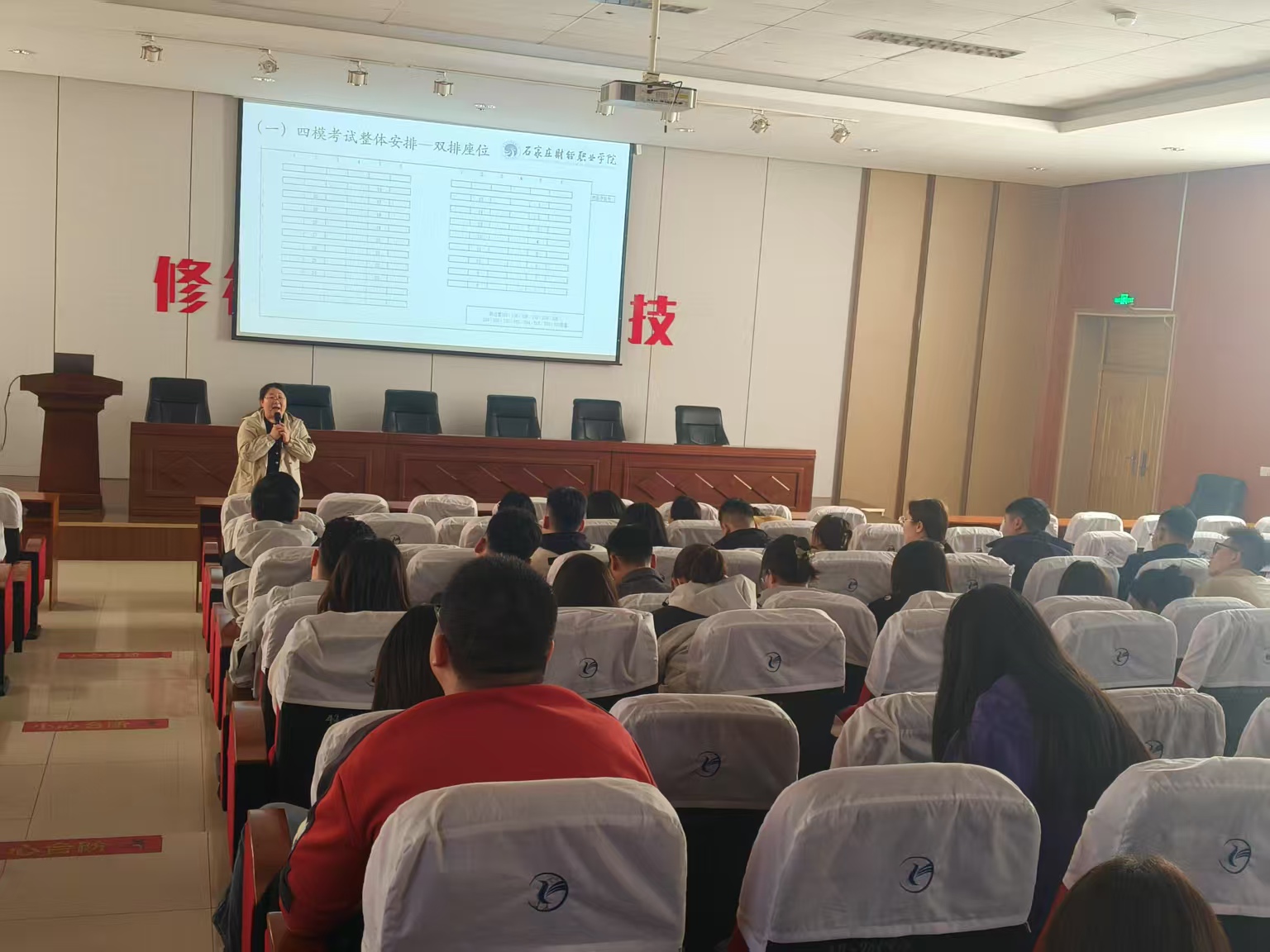 为助力单招冲刺,顺利开展模拟考试,我校区于3月13日精心组织了第四次全真模拟单招考试培训会,会议由教务处副处长王景超主持,四模考试全体监考教师及考务人员参加。