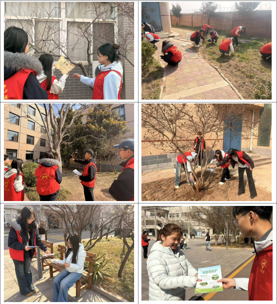 春回大地,绿意盎然,为深入践行“绿水青山就是金山银山”的生态理念,传承雷锋精神,强化师生爱绿、植绿、护绿的责任意识,近日,我院开展“植”愿同行——校园植绿护绿雷锋志愿服务项目,志愿者们以实际行动为校园添绿增彩,让雷锋精神在护绿实践中绽放光芒。本次志愿服务涵盖六大特色项目,志愿者们分工协作、热情投入,用双手守护校园绿意,传递文明力量。