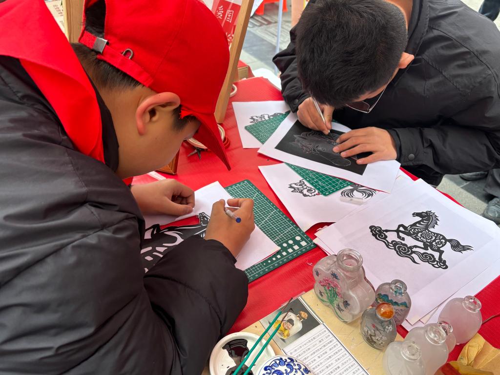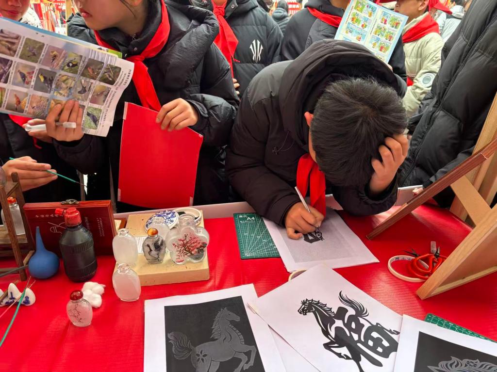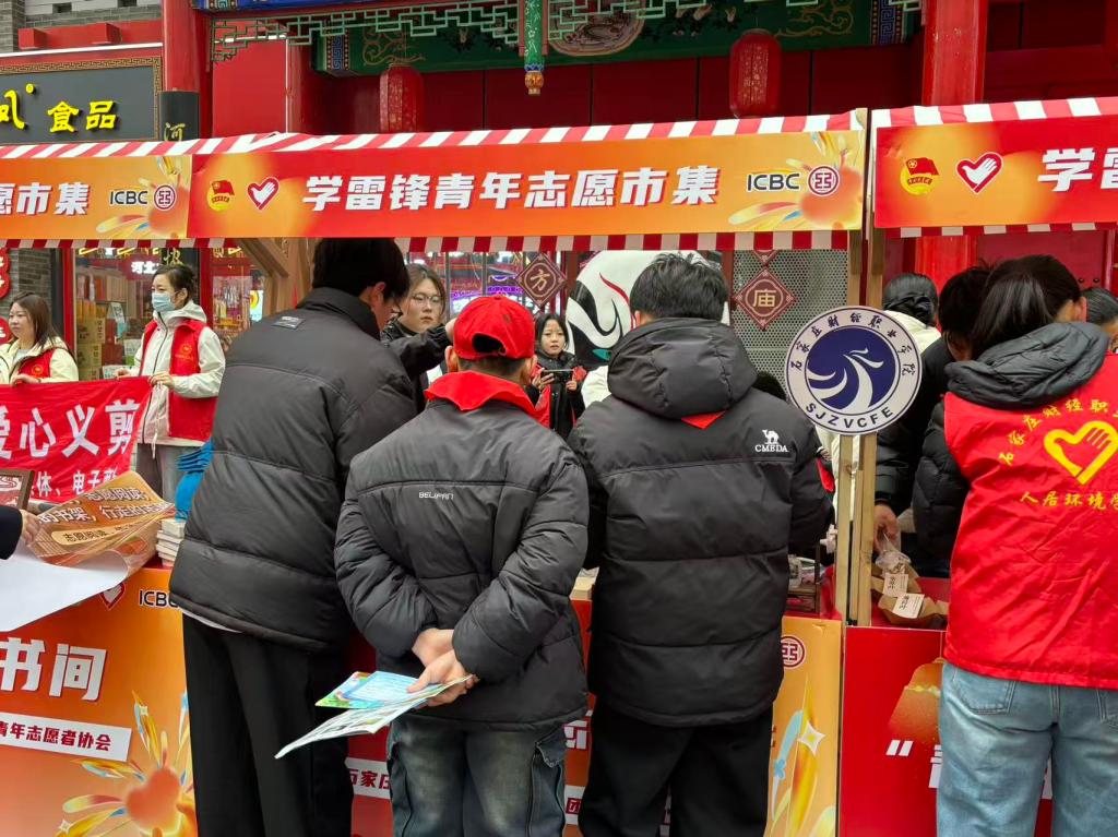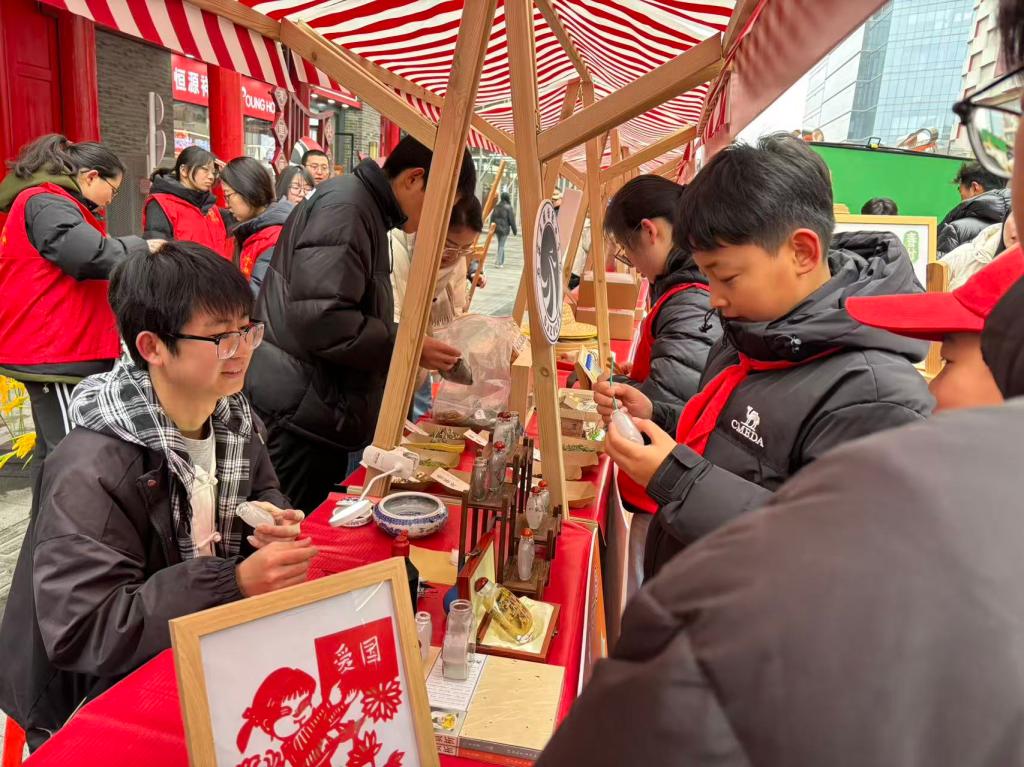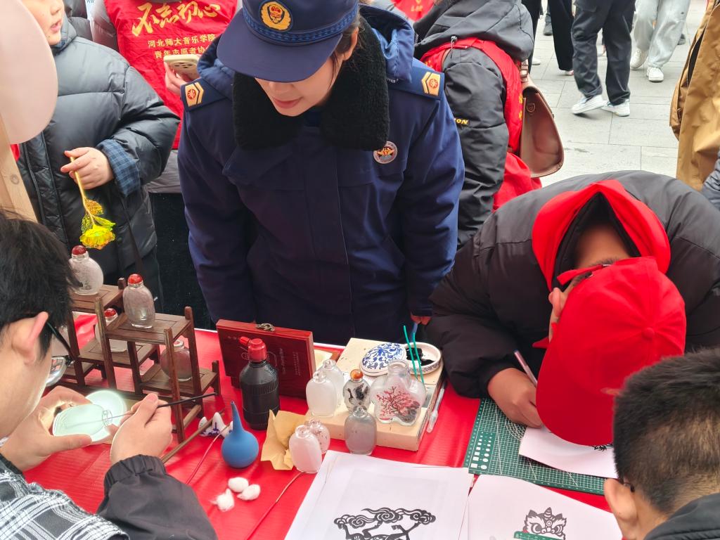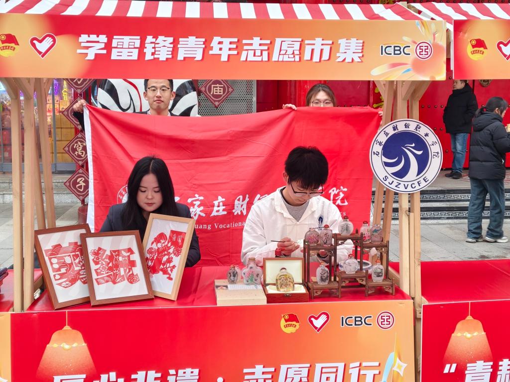 非遗志愿传扬雷锋精神,在第63个学雷锋纪念日到来之际,3月5日,石家庄市“青年友好 志愿先行”学雷锋志愿服务日主题活动在湾里庙步行街火热开展。我校非遗社团内画工作室与剪纸社亮相志愿服务市集,以“非遗传承+志愿奉献”的形式,让传统技艺在街头巷尾焕发青春活力。
