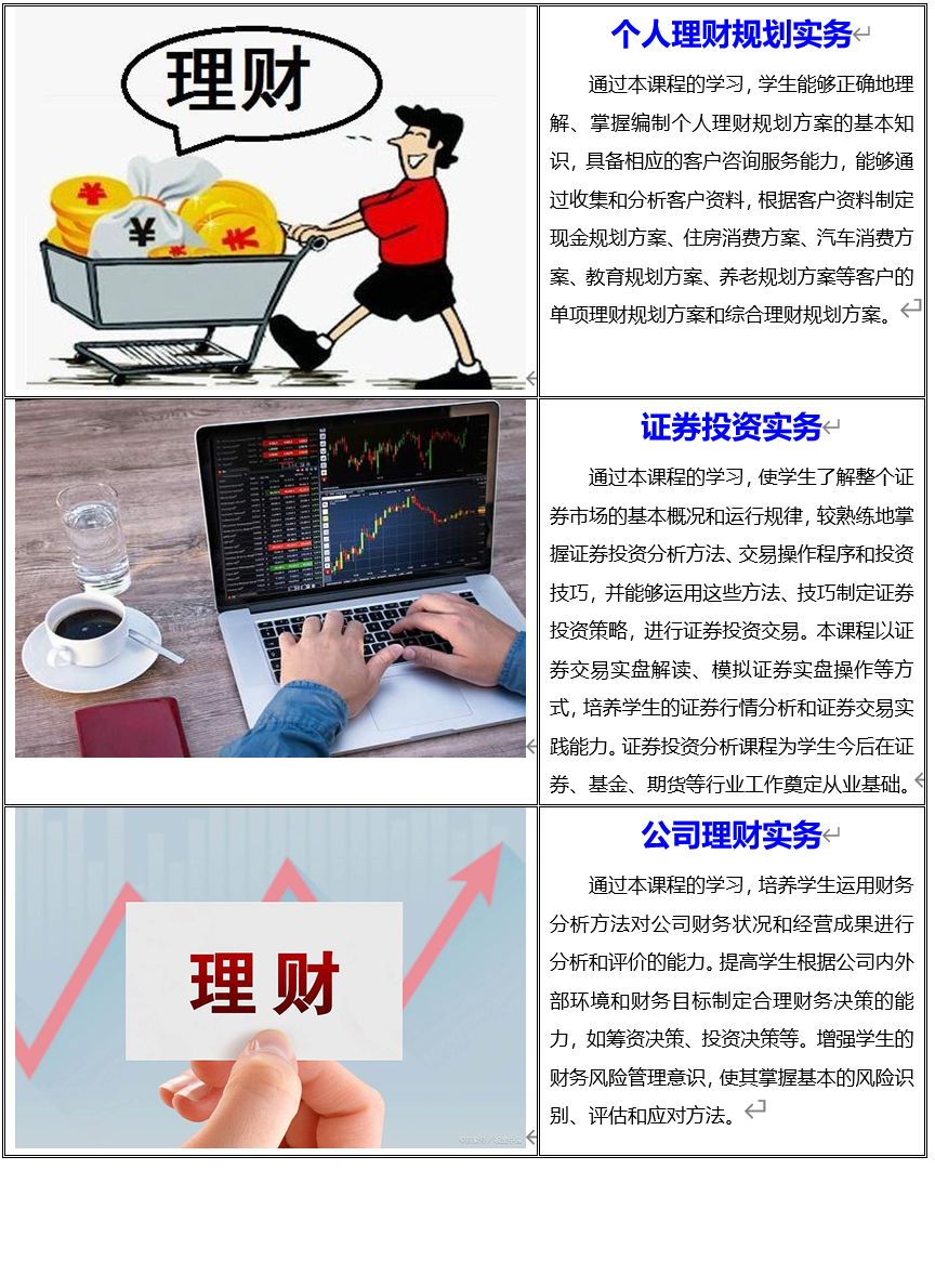 金融服务与管理专业已与多家金融机构签订校企就业合作协议,有效保证了学生专业技能的实习实训。如北京指南针投顾、河北源达投顾、招商证券、北京天相财富等。