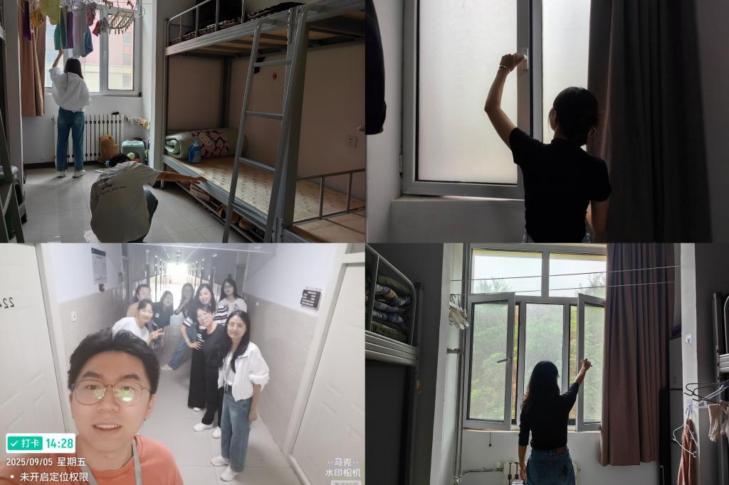 此外,辅导员们同步开展消防安全与设施排查,清理了走廊内堆放的杂物,确保消防通道畅通;逐一检查床铺、桌椅、水龙头等设施完好情况,针对部分宿舍存在的阳台堆放物品,辅导员们现场拍照记录,建立整改台账,确保所有隐患全部清零。提前返校的学生也表示,整洁安全的宿舍让他们倍感亲切,能更快投入新学期生活。