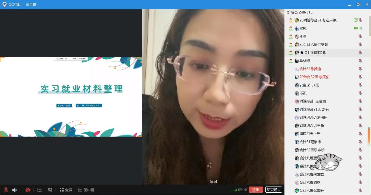 班会最后,侯老师鼓励同学们经常与学校、老师、同事交流,圆满完成岗位实习,并对已经结束实习工作,准备就业创业的同学们提出了三点要求:一、做好就业工作的思想准备和心理准备;二、要坚守初心,脚踏实地,结合自己的专业特长、兴趣及职业规划,选择就业岗位;三、要从大处着眼小处着手,认真对待就业;培养自己励志弥坚、吃苦耐劳的品格。