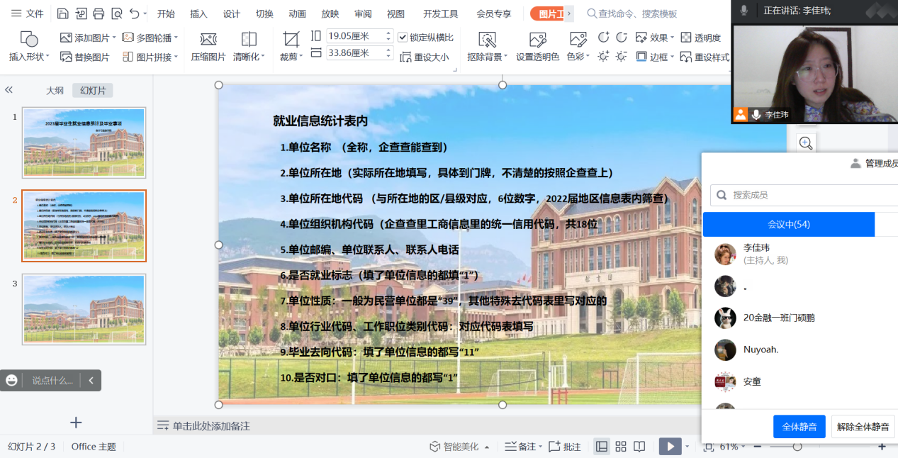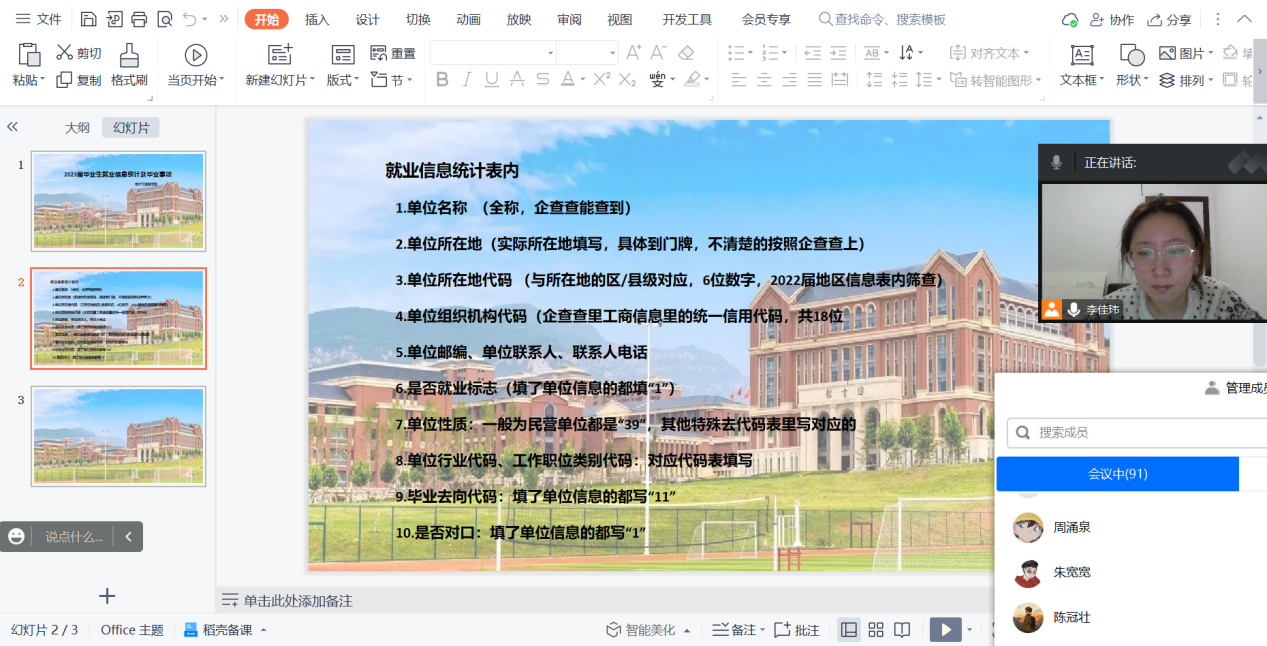 本周我院辅导员李佳玮陆续为毕业班学生分班开展就业信息统计工作宣讲会,会议围绕就业单位基础信息以及就业纸质材料提交要求两方面为学生详细说明了学校在就业工作上的具体要求,为配合好我省教育部对就业工作的安排部署,严格按照就业标准数据上传信息,保证我院20届毕业生就业数据有效准确。