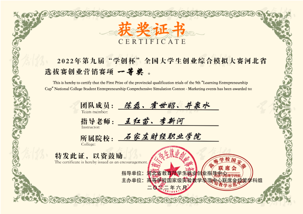 2022年第九届“学创杯”全国大学生创业综合模拟大赛河北选拔赛创业综合模拟赛项一等奖