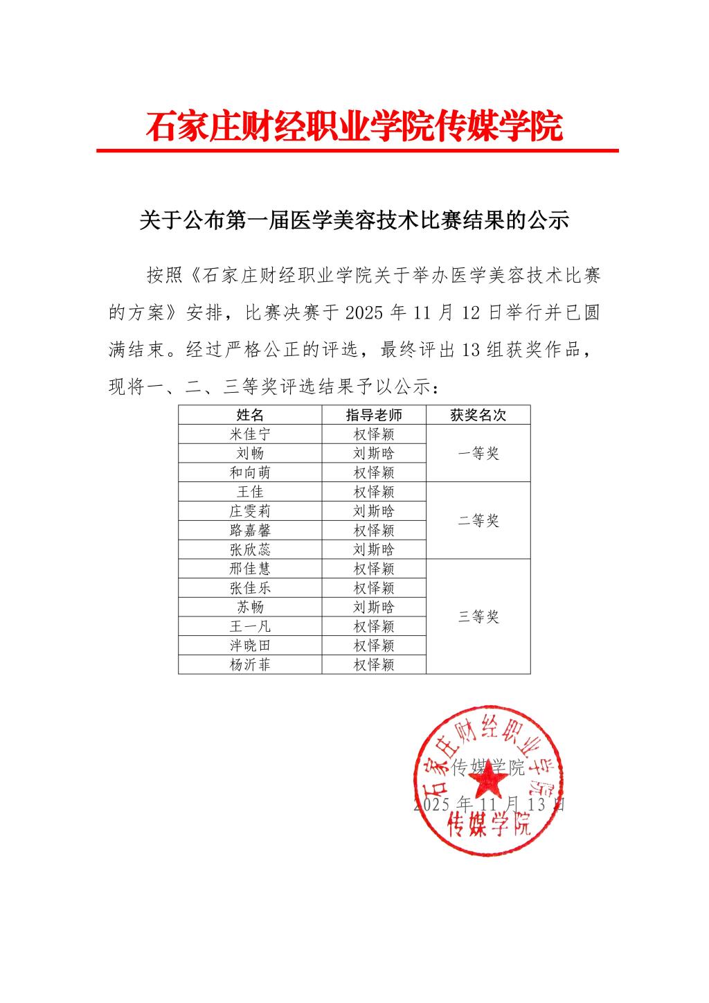 关于公布第一届医学美容技术比赛结果的公示