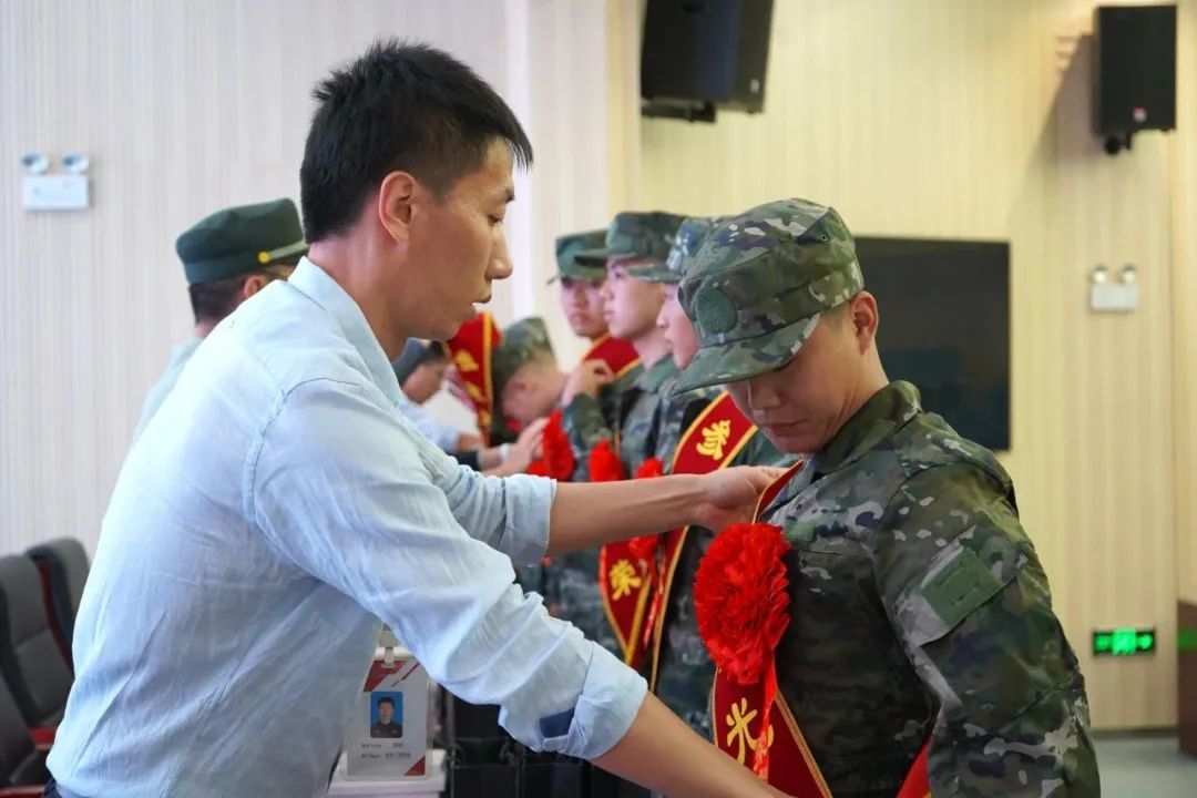 参会领导为我校入伍新兵佩戴大红花,并赠送纪念品。