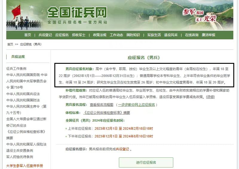 全国征兵网的年龄计算方式为:应征报名对象年龄=应征年份-出生年份。在校生年龄要求为18--22周岁;毕业生年龄要求为18--24周岁。