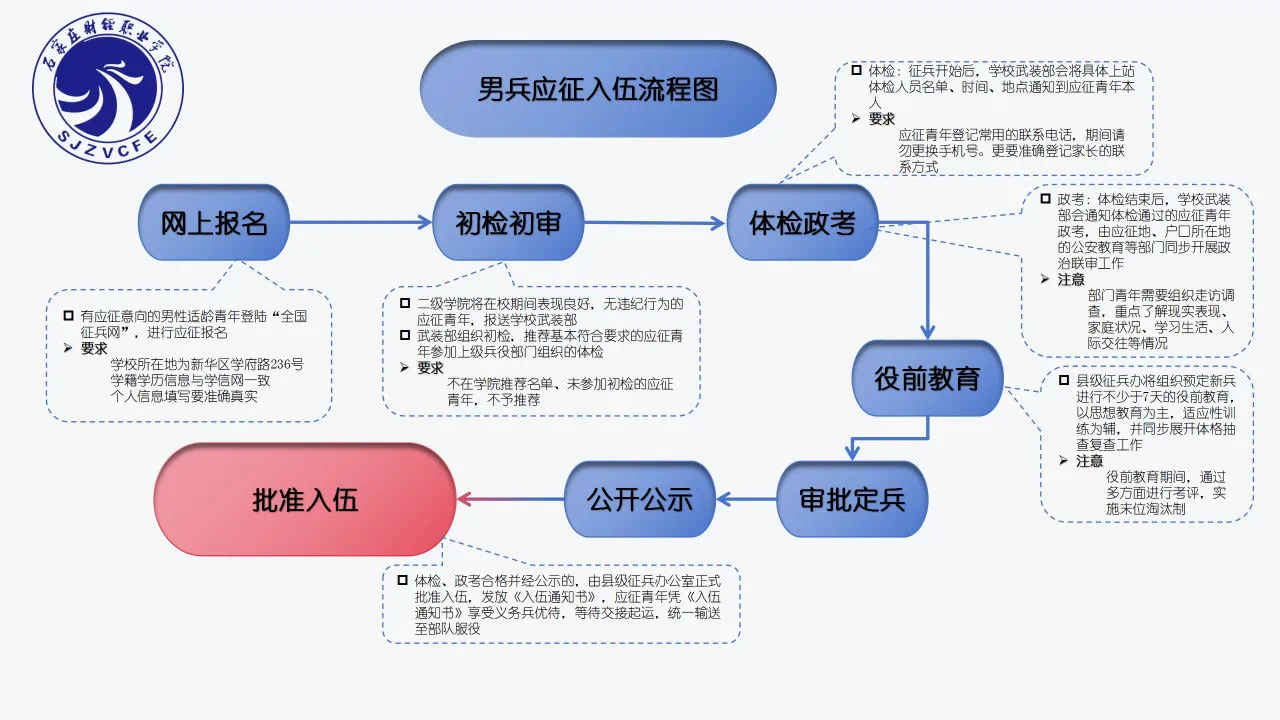 根据学校的征兵工作安排,凡我校学生有意愿参军入伍,在网上报名完成后,辅导员老师针对学生在校期间表现以及学业完成情况进行初步考察,考察通过后会推荐到学校武装部,才可以参加学校组织的初检、上级兵役部门组织的体检等后续工作。