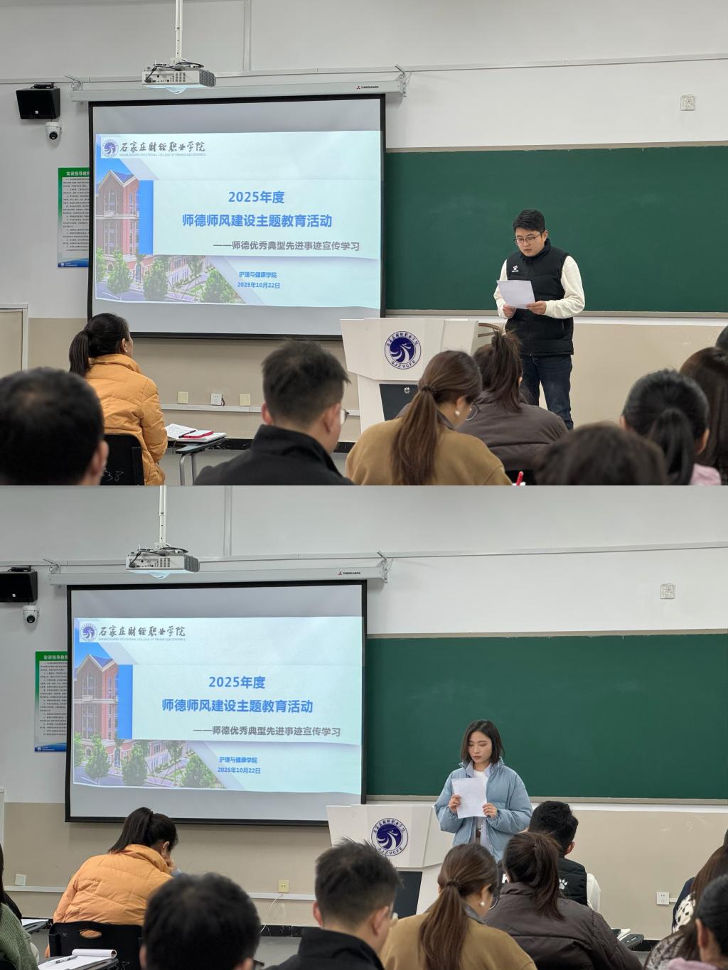 为贯彻执行《亚英体育ag关于开展2025年度师德师风建设主题教育月活动的通知》(人事处〔2025〕14号)文件要求,进一步加强护理与健康学院师德师风建设,提高全院教职工职业道德素养,根据《护理与健康学院2024年度师德师风建设主题教育实施方案》工作要求,我院于10月22日在实训楼C座310实训室进行了师德师风主题教育系列活动,活动内容包括入开展师德教育和师德警示教育活动、开展师德优秀典型先进事迹宣传学习和开展师德师风优秀案例评选三项内容。本次活动由护理与健康学院院长张宁主持,学院全体教职工参加。