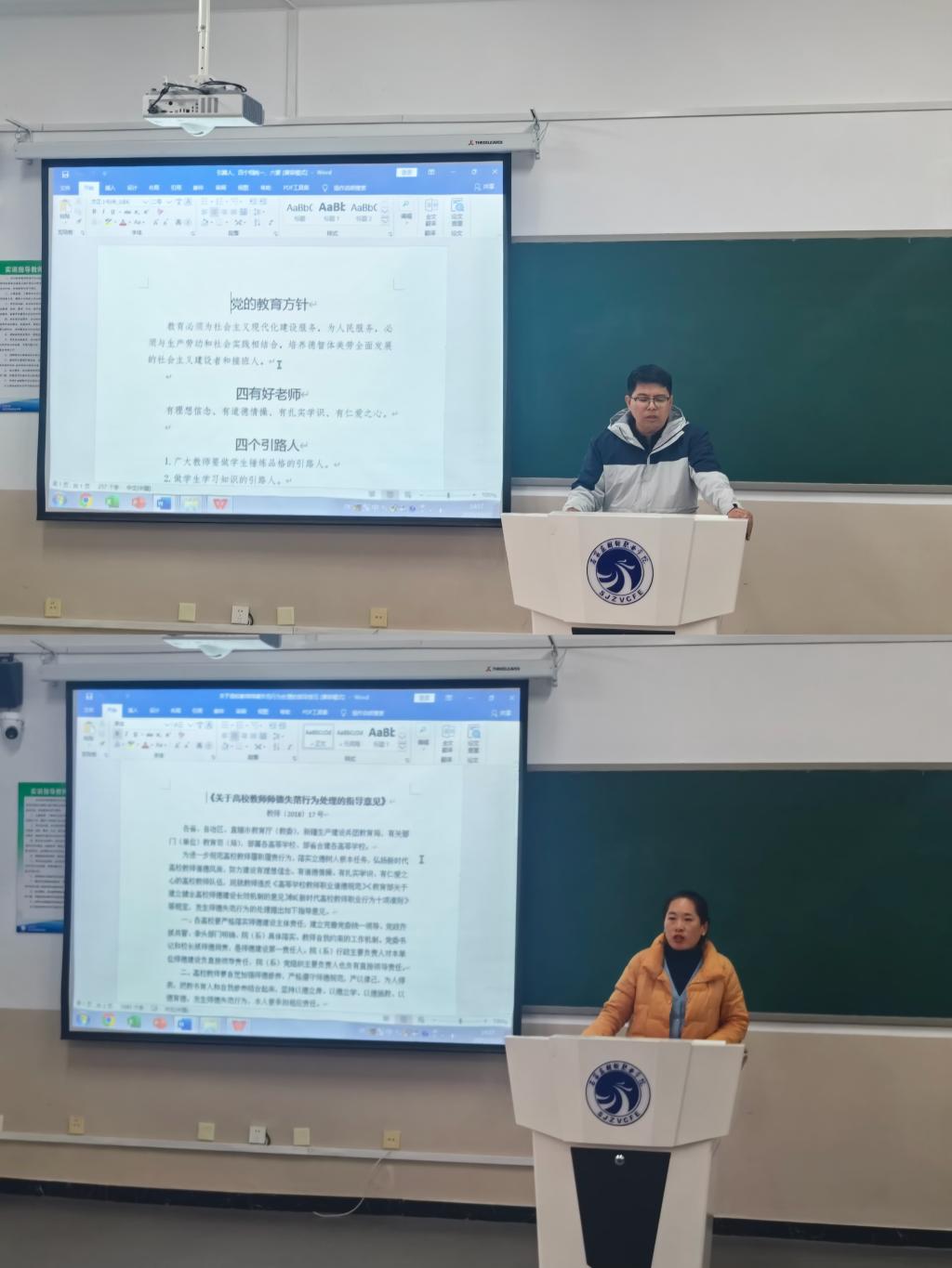 其次,由教师代表王嫣然和辅导员代表何宇航两位教师携手引领全体教职工共同观看精心挑选的视频资料,深入学习“七一勋章”获得者张桂梅老师那感人至深的“燃灯精神”。通过这一环节,不仅让大家深刻领会张桂梅老师无私奉献、点亮学生人生之路的高尚情操,同时还结合自己在教学岗位和辅导员岗位具体先进事迹,讲述自身对师德的理解。通过展示这些身边的榜样力量,旨在激发每一位教师内心深处“见贤思齐”的强烈愿望和内生动力,进一步推动学院师德师风建设向更高水平迈进。