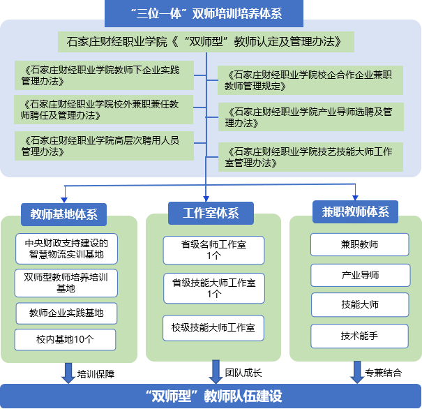 团队核心成员20人均为国家第二批现代学徒制试点院校骨干成员,其中高级职称80%,硕士研究生90%,“双师型”教师90%,成员中河北省“三三三人才工程”第三层次人选1人、“河北省优秀教师”2人、“河北省优秀教育工作者”1人、“河北省师德标兵”2人、“河北省职业教育德育工作骨干管理人员1人”,荣获省部级荣誉称号18项。团队实施高水平“双带头人”培养、高素质骨干教师成长、高起点“双师型”教师培养计划,助推教师“职业化、团队化、专业化”,构建了“双核多维”教师职业发展路径模型,形成了“三位一体”双师培训培养体系,打造高水平结构化有影响力的教师创新团队。