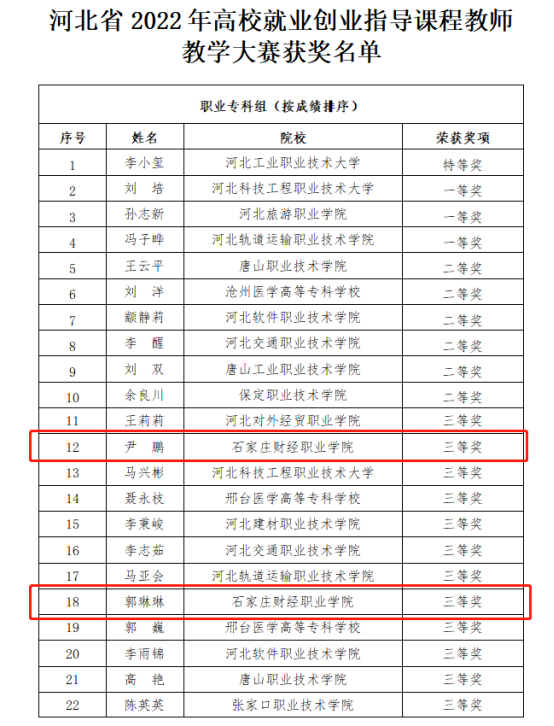近日,河北省教育厅公布了2022年高校就业创业指导课程教师教学大赛获奖名单,我校尹鹏、郭琳琳两位教师荣获三等奖。