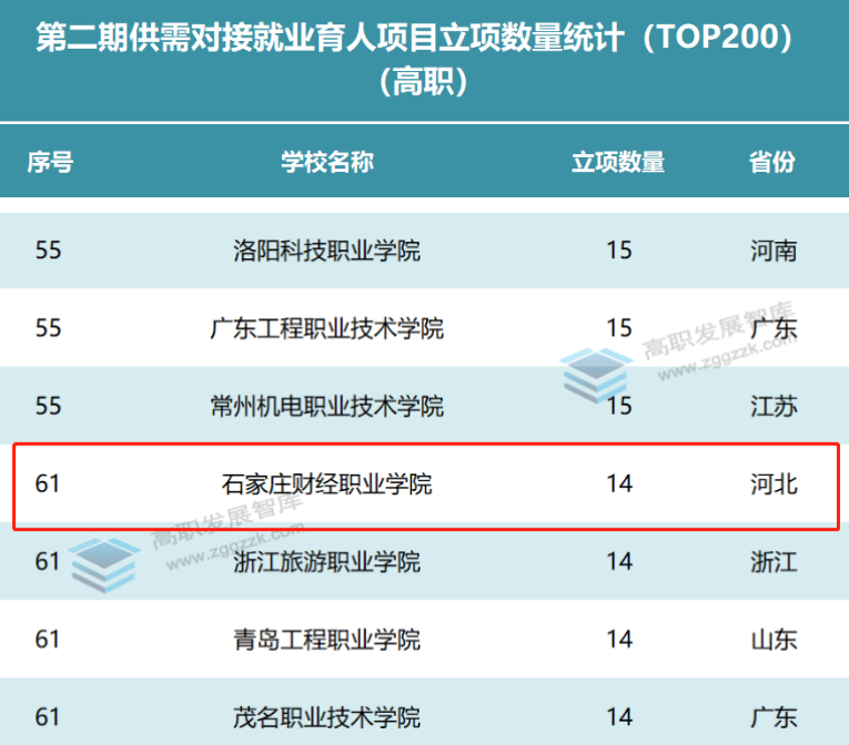 为落实党中央、国务院“稳就业”“保就业”决策部署,深化产教融合、校企合作,推动人才培养与就业有机联动、人才供需有效对接,教育部组织有关用人单位和高校实施供需对接就业育人项目。全国共有889所高职院校的4679个项目获得立项,我校“定向人才培养培训项目”“就业实习基地项目”“人力资源提升项目”共计14个项目获批立项,全国排名第61位,河北省排名第3位。