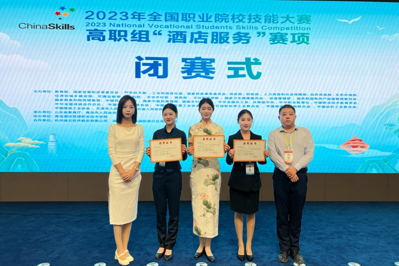 9月8日,由教育部主办,青岛酒店管理职业技术学院承办的2023年全国职业院校技能大赛高职组“酒店服务”赛项圆满收官,来自全国高职院校62支队伍参加了本次比赛。我校酒店管理与数字化运营专业学生于越、吴美萱、侯卓然组成的代表队荣获团体二等奖。