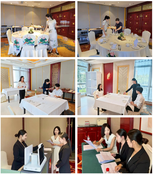 酒店服务赛项为团体赛,由前厅接待、中餐服务和西餐服务三个模块组成。其中,前厅接待分为办理入住、退房离店、投诉或突发事件处理;中餐服务分为主题宴会设计、宴会服务;西餐服务为休闲餐厅服务。赛项内容涵盖了旅游大类酒店管理与数字化运营专业的核心技能和相关岗位职业素养,反映了现代酒店工作个性化服务、信息化操作、国际化趋势的特点,体现了酒店工作过程的规范化、实境化、流程化、个性化与职业化要求。