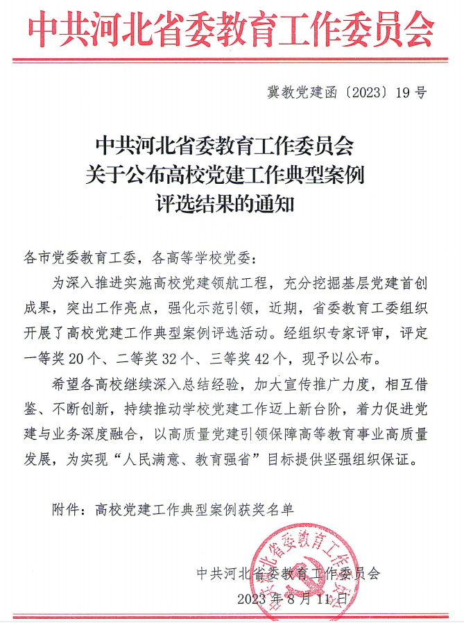 近日,中共河北省委教育工作委员会发布《关于公布高校党建工作典型案例评选结果的通知》,揭晓了高校党建工作典型案例评选结果。我校《党建“红色引领” 助推学校高质量发展》荣获省级二等奖,实现学校党建工作新突破!充分展示了我校党委通过创建“红色引领”党建品牌活动,推动学校党建工作守正创新、特色发展的实践成果。