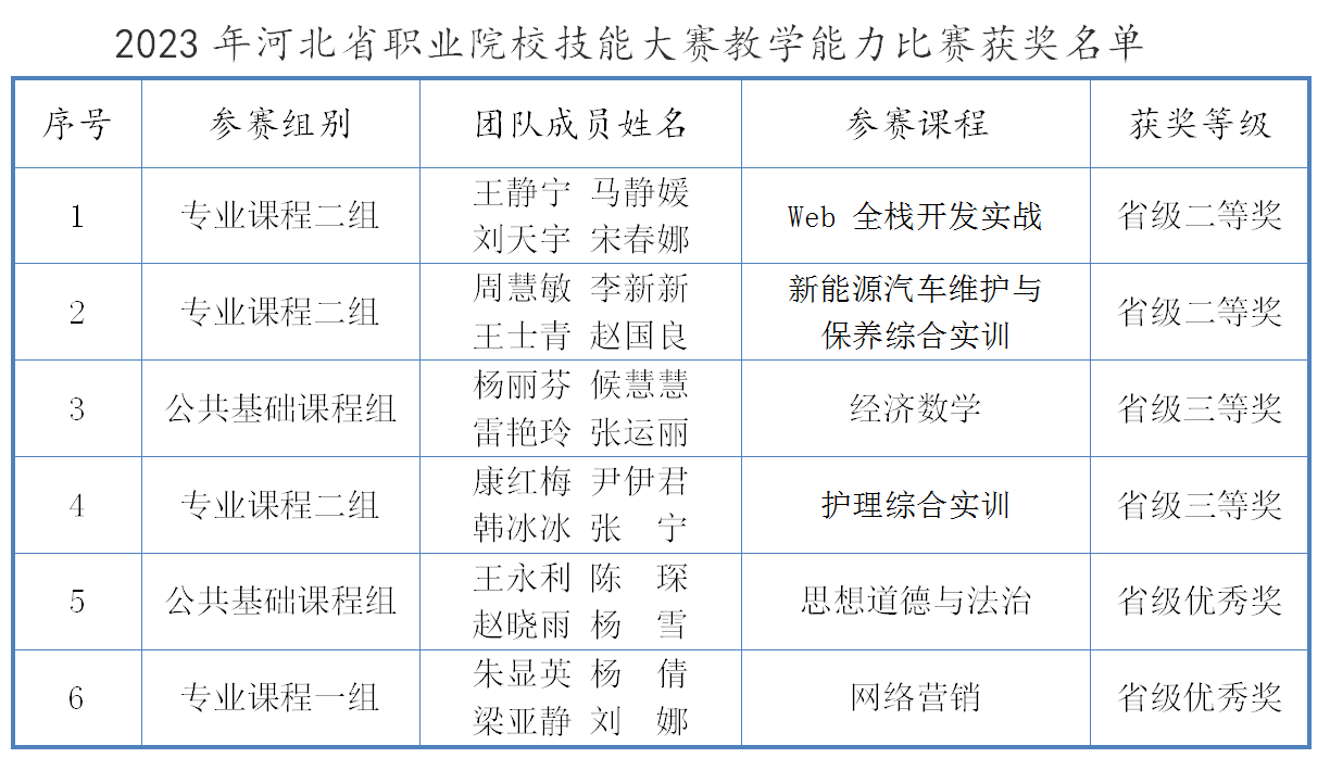 近日,河北省教育厅发布了2023年河北省职业院校技能大赛教学能力比赛结果,我校再创佳绩!荣获二等奖2项、三等奖2项、优秀奖2项。