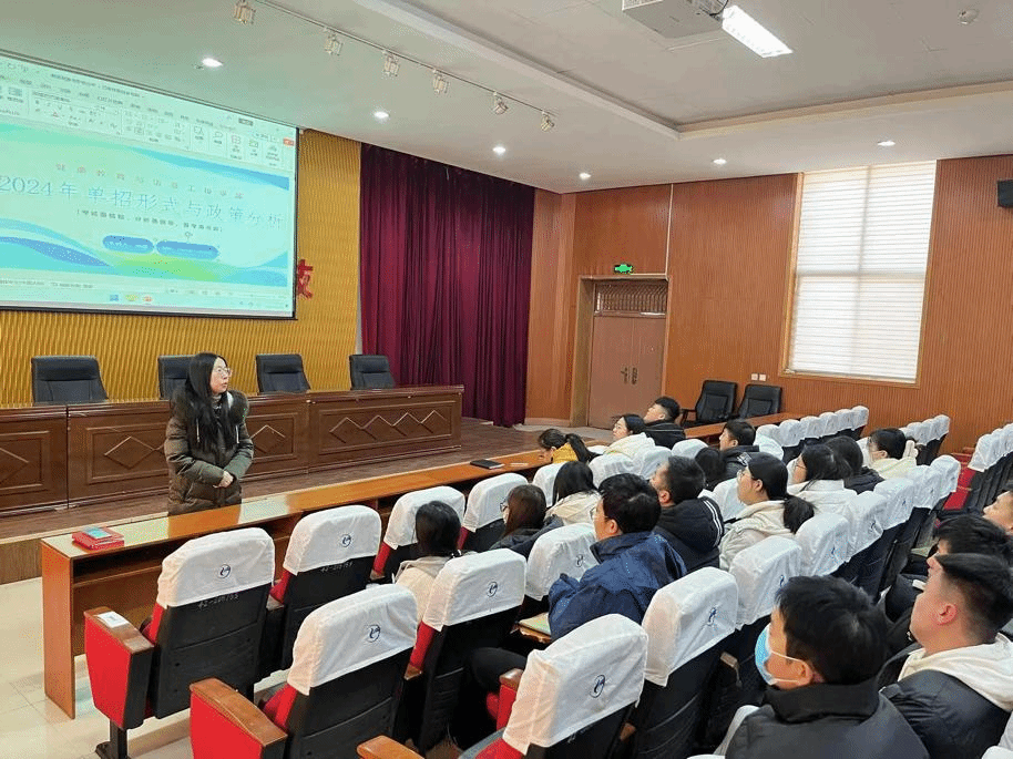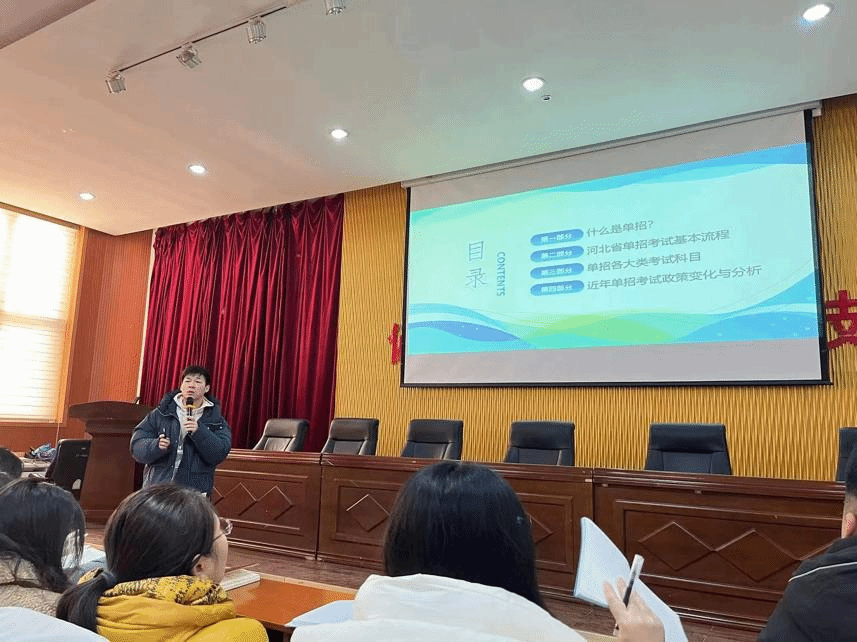 随后,周晨老师的《2024年单招形势与政策分析》主题培训,从什么是单招、河北省单招考试基本流程、单招各大类考试科目、以及近年单招考试政策变化与分析,四个方面条分缕析、深入地将单招考试剖析透彻。周老师紧紧围绕单招考试的讲解,使辅导员对于单招考试有了清晰明了的认识,知己知彼,才能百战不殆。