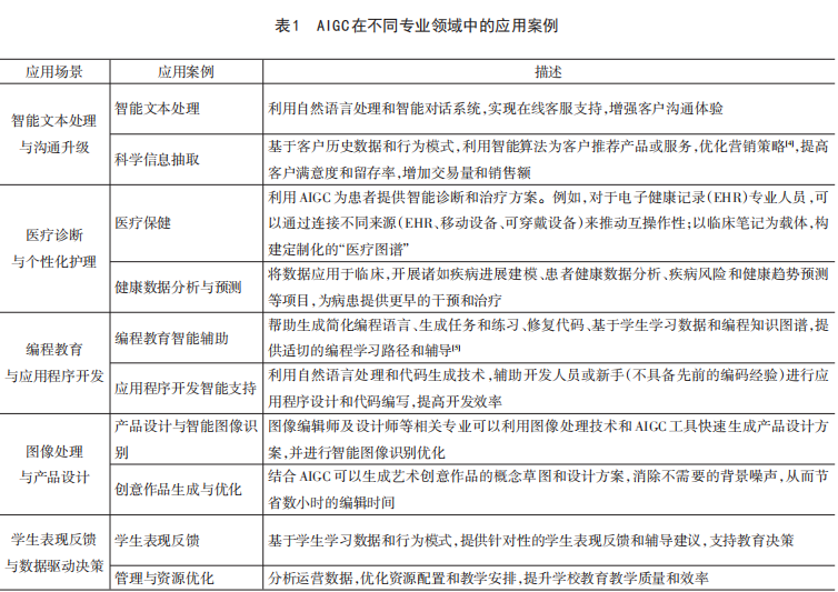 随着AIGC在全球范围的迅猛发展,其在职业教育领域的应用场景也日益呈现出拓展与深入化的趋势。AIGC在职业教育中的持续演进,不仅仅局限于“一维”的信息传递与知识灌输,而是体现出“多维”的技术导向与教学形式变革。该“多维”特性主要体现在智能文本处理与沟通升级、医疗诊断与个性化护理、编程教育与应用程序开发、图像处理与产品设计以及学生表现反馈与数据驱动决策等诸多方面(表1)。