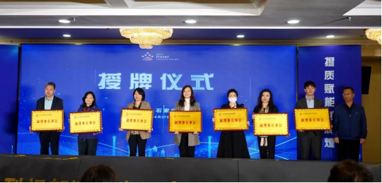 伴随着热烈的掌声,刘晶、刘永涛、刘桂玲、王玉苗、杨永利、肖石震、赵建华、李文涛、许继海等9位领导共同为河北省酒店职业教育集团揭牌。