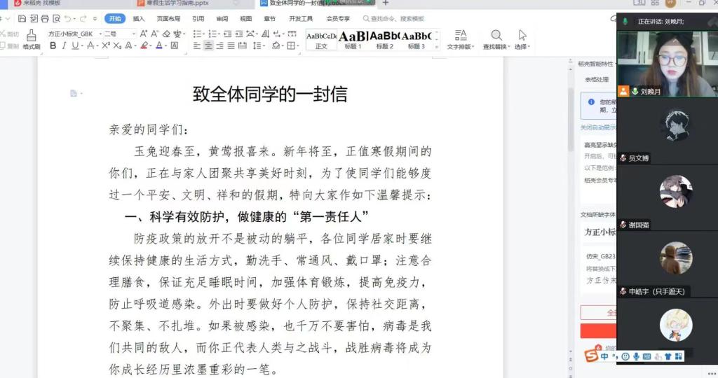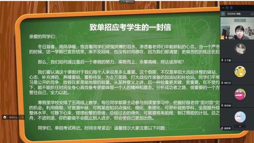 20221225日,电子信息学部各班级在辅导员的带领下,有序开展寒假“致全体同学的一封信”主题班会活动。