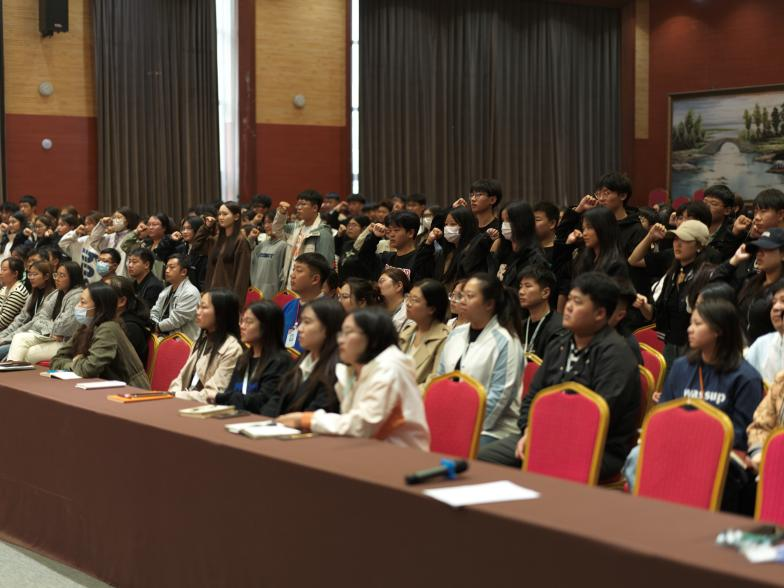 发言完毕后,团委副书记史宝田带领全体同学起立,举起右拳进行宣誓,健康教育与信息工程学部学生庄严宣誓。