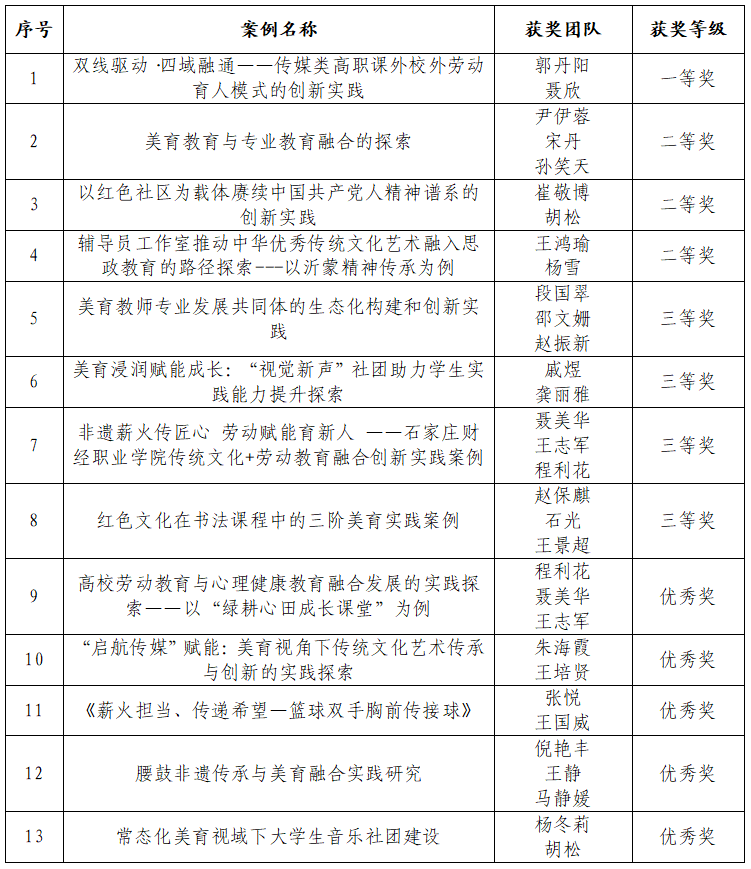 根据《亚英体育ag关于征集“落实五育并举,强化学生体育、美育、劳动教育”优秀案例的通知》(教务处[2025]14号)工作安排,经过各单位积极申报与推荐,学校评审,评选出一等奖1项、二等奖3项、三等奖4项、优秀奖5项。现将拟获奖名单予以公示(名单详见附件)。