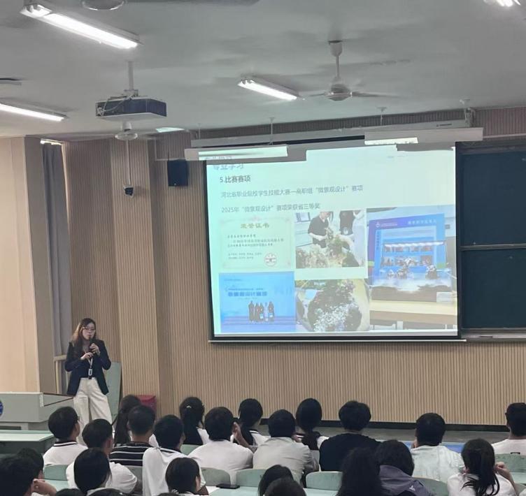 针对园林技术专业,主讲人从乡村振兴战略需求出发,详解其人才培养定位—依托园林景观设计实训室、园林数字化实训室等实训平台,培养兼具植物养护、景观设计、工程管理能力的复合型人才。现场展示的2024“建行杯”河北省大学生创新大赛铜奖、2025年河北省技能大赛微景观设计赛项三等奖等荣誉,直观呈现了“岗课赛证”综合育人模式的显著成效。