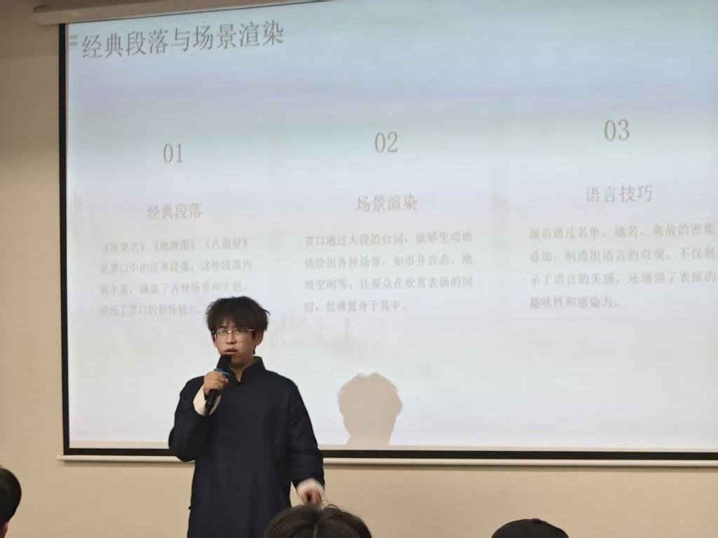 作为校园文化建设的鲜活载体,曲艺社始终以“传承+创新”为内核:从日常社团活动里的曲艺知识分享、经典片段排练,到以“雅聚”为名的文化氛围营造。它以低门槛的参与方式,打破了传统艺术与青年群体的距离——无论是对戏曲唱腔好奇的新生,还是能熟练打快板的爱好者,都能在这里找到与传统对话的切口,让“相声里的幽默”“戏曲里的情怀”,成为财园学子课余生活的鲜活注脚。