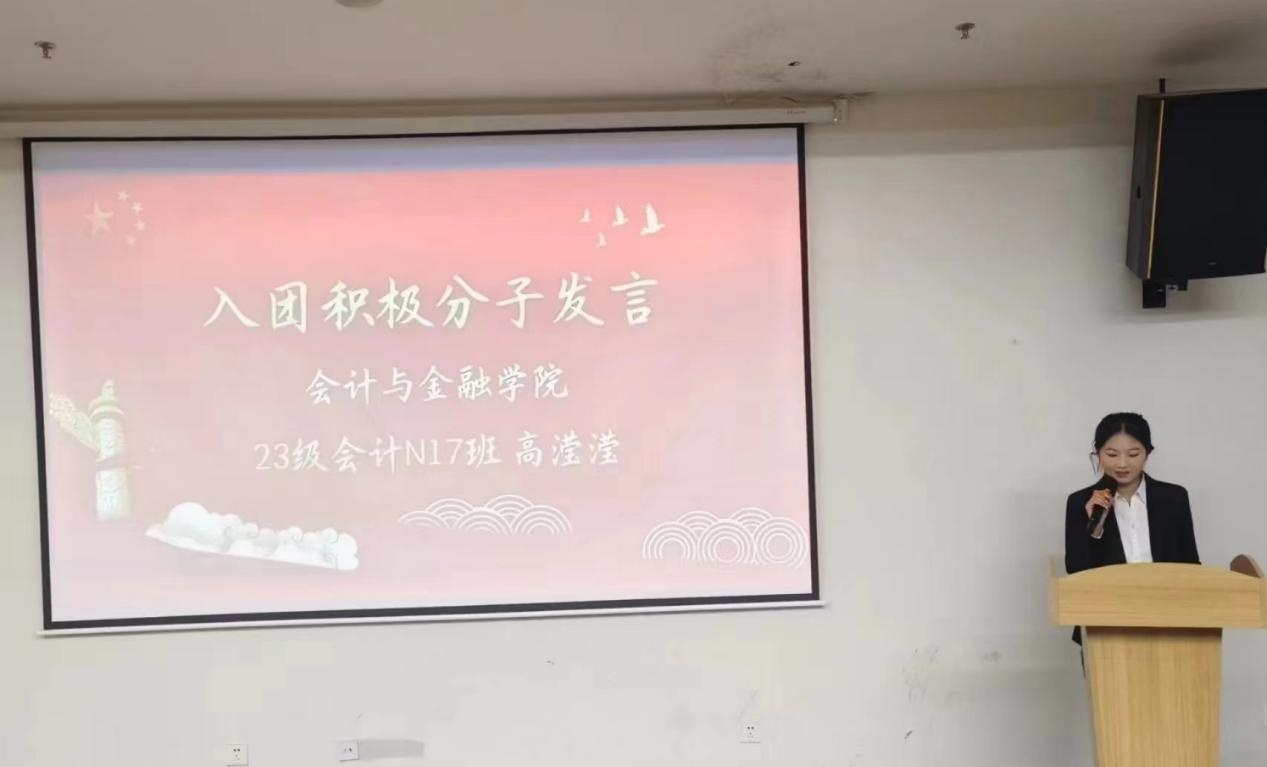 随后,会计与金融学院23级大数据与会计N17班高滢滢代表入团积极分子发言,并号召同学们树立崇高的理想,明确团员任务,遵守团的章程,争取在团课学习中取得优异成绩,向着团的耀眼光芒大步迈进,力争早日成为一名优秀的共青团员。