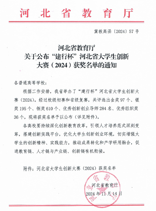 近日,河北省教育厅公布了《关于公示“建行杯”河北省大学生创新大赛(2024)获奖名单》,我校参赛团队在“青年红色筑梦之旅”和“职教赛道”共获得2金2银14铜的佳绩,创造了历年来省级决赛最好成绩,同时“职教赛道”2个金奖项目顺利入围国赛,获奖比例及个数再创历史新高。