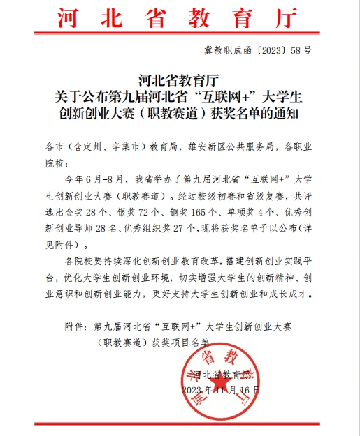近日,由河北省教育厅、中国建设银行河北省分行主办,河北工业职业技术大学承办,北京智投网络科技有限公司、新道科技股份有限公司、新产教河北信息科技有限公司协办的第九届河北省“互联网+”大学生创新创业大赛(职教赛道)获奖名单揭晓。经过大赛激烈角逐,我校参赛团队在本届大赛中共斩获金奖1项,并入围国赛,铜奖3项,获奖比例及个数再创历史新高。