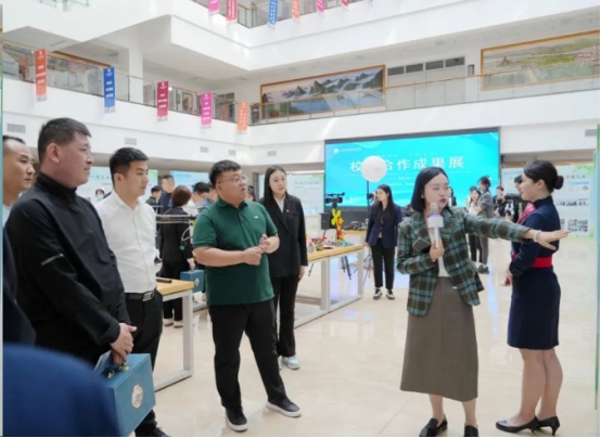随后,赵建华校长等一行人员陪同与会嘉宾到图书馆二层中庭参观我校展出的校企合作成果。展览以文本、图片、视频、实物类产品等形式重点展示了校企协同育人、科技研发成果、优秀毕业生风采、师资队伍建设、订单教育等产教融合成果,各位领导对学校在校企合作方面取得的优秀成果给予了充分肯定和高度评价。