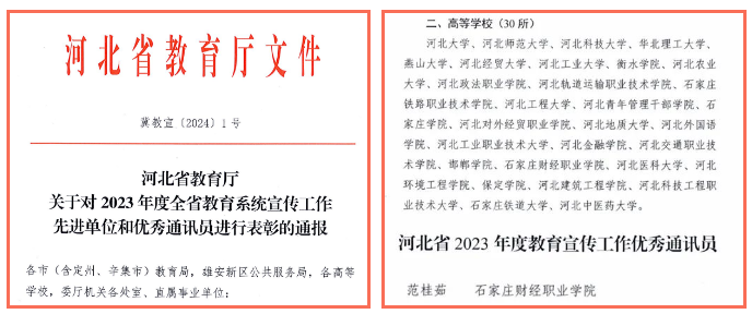 近日,河北省教育厅对2023年度全省教育系统宣传工作先进单位和优秀通讯员进行了通报表扬。我校获评“河北省2023年度教育宣传工作先进单位”。党委宣传部范桂茹同志被评为“河北省2023年度教育宣传工作优秀通讯员”。