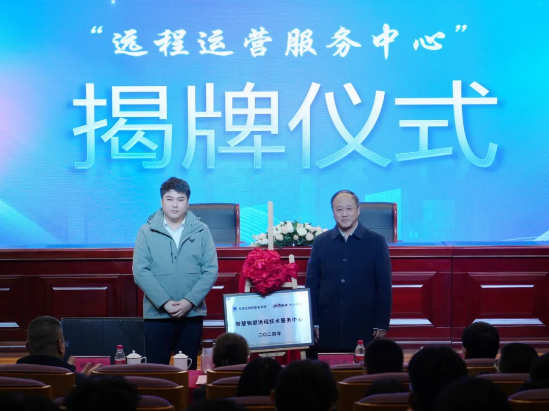 致辞结束后,在全场嘉宾的热烈掌声中,薛向东书记和大华公司区域经理李辉共同为“远程运营服务中心”揭牌,大华公司副总经理段成钢为 “智慧物联产业学院” 揭牌,李同鑫副校长和大华公司总监伍小明共同签署了校企合作协议。这标志着双方的合作正式启动,将在未来的日子里携手共进,为智慧物联产业的发展贡献力量。