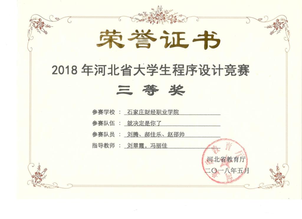 2018年河北省大学生程序设计竞赛三等奖