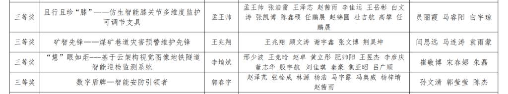 2023 年 3 月我校启动了中国国际大学生创新大赛(2024)校赛暨“第四届”校长杯创新大赛,本次大赛报名参赛项目超过了 2000项。经专家初审、复赛评审等环节评分,最终决出特等奖 17 项、一等奖 26 项,二等奖 30 项,三等奖 32 项、优秀组织奖 3 个,现将获奖名单予以公布。其中,信息工程学院荣获特等奖两项、一等奖四项、二等奖三项、三等奖四项,荣获优秀组织奖。