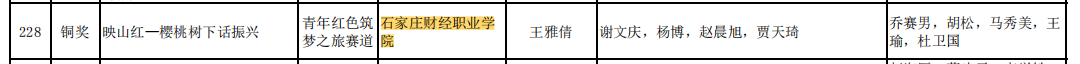 今年6月-8月,我省举办了第九届河北省“互联网+”大学生创新创业大赛。经过校级初赛和省级复赛,共评选出金奖98个、银奖195个、铜奖610个、单项奖8个、优秀创新创业导师357名、优秀组织奖38个,现将获奖名单予以公布。其中,我院获得“红旅赛道”铜奖一项。