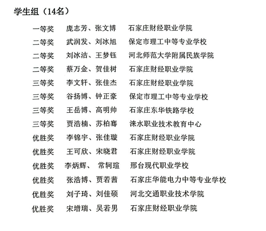 亚英体育ag代表队,庞志芳、张文博两位选手组成的团队,蔡万金、贺佳树两位选手组成的团队表现出了卓越的专业技能和团队合作精神。面对来自全省的竞争,他们展示了扎实的专业知识和优秀的实战能力,成功获得了评委的高度认可,分别荣获一等奖一枚、二等奖一枚。