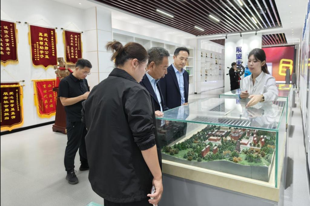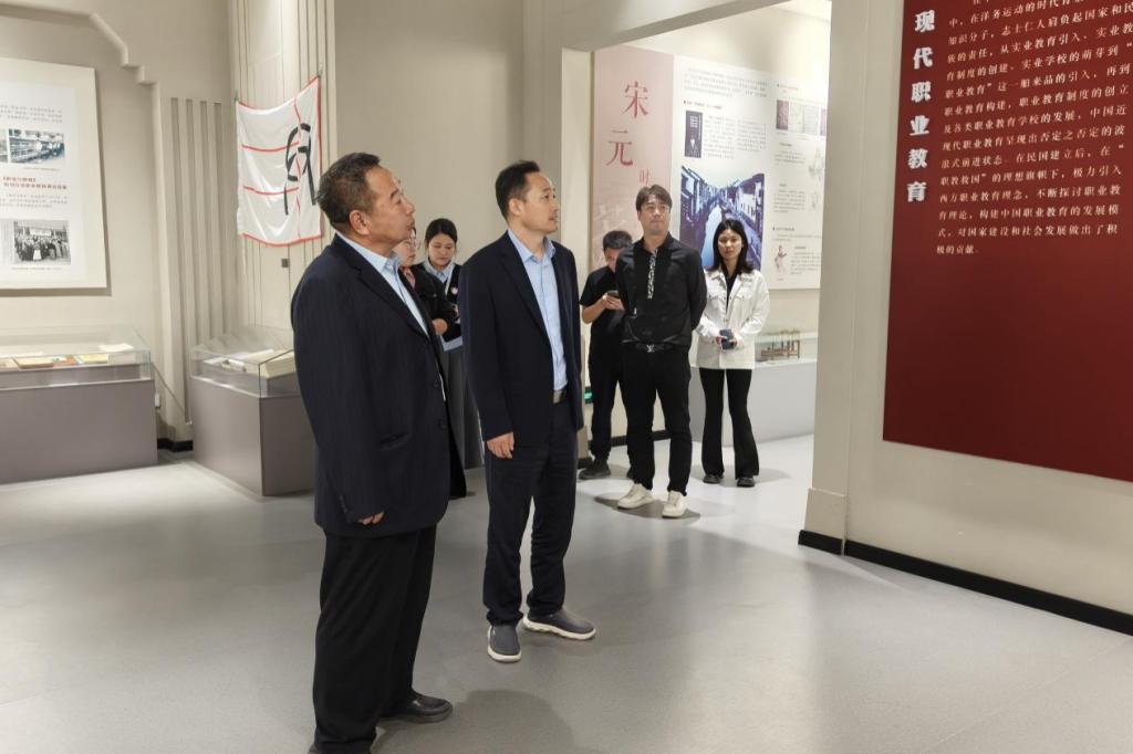 随后,双方前往校园展室群开展交流。在职业教育展览区,通过图文展板、实训成果等形式,嘉宾们深入了解了职业教育的“前世今生”。在党史展览区,一幅幅珍贵的历史图片、一段段详实的文字材料,共同勾勒出党的百年奋斗历程。